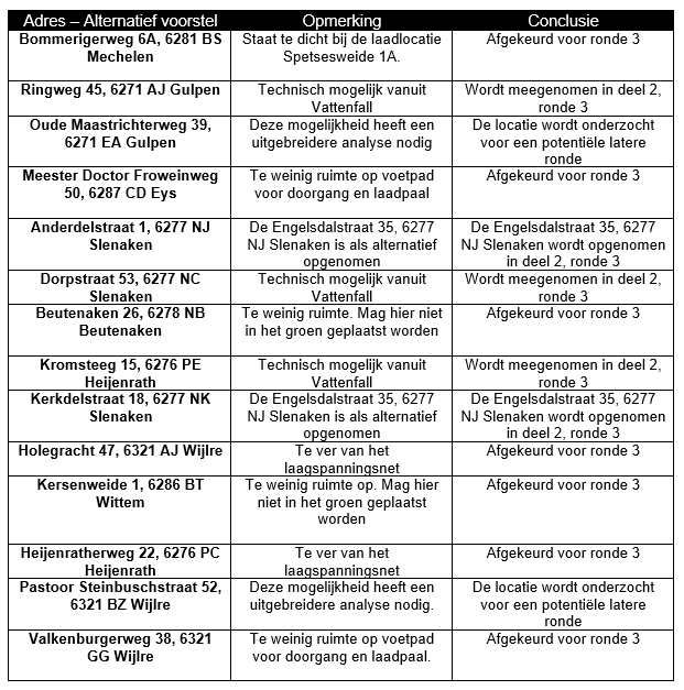Verder zijn de voorgestelde alternatieve laadlocaties geëvalueerd, waarbij 4 locaties zullen worden opgenomen in deel 2, voor verdere goed- of afkeuring: